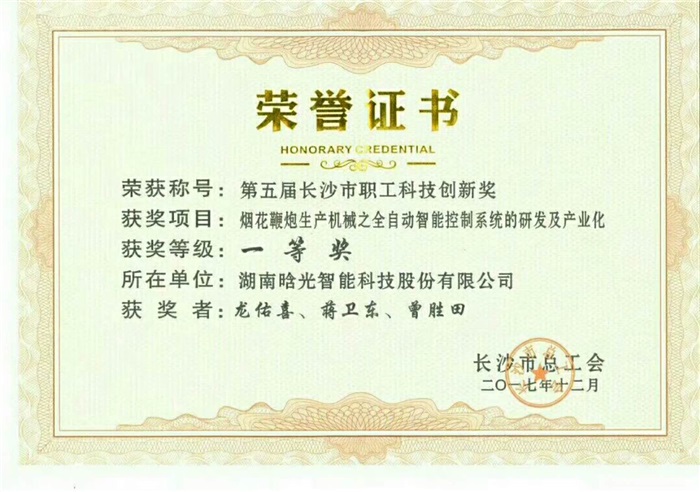 熱烈祝賀晗光智能的研發項目獲長沙市科技創新一等獎,項目技術帶頭人龍佑喜先生獲長沙市五一勞動者獎章。